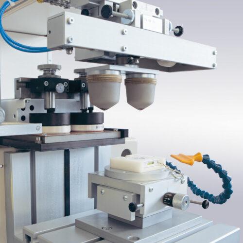 Für einige Anwendungen kann es von Vorteil sein, nicht das Druckobjekt, sondern die Tampons zu verschieben, um mehrere Farben in einem Arbeitsgang präzise aufzudrucken. Tamponverschiebevorrichtungen für 2-Farbendruck werden häufig auch an Handarbeitsplätzen eingesetzt und stehen in pneumatischer Ausführung in verschiedenen Grössen zur Verfügung.