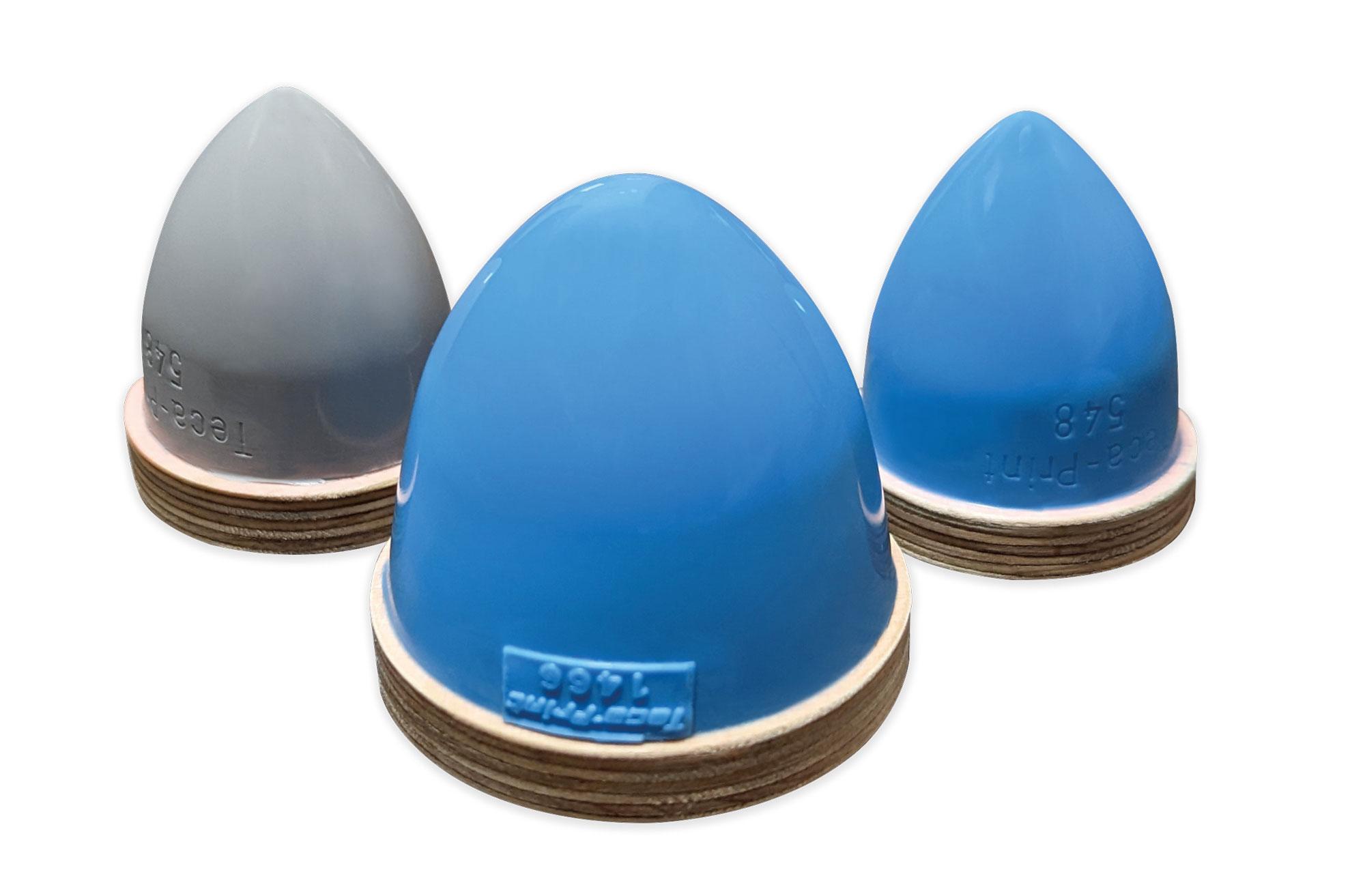 MaxX-Drucktampons in der Härte 50 Shore 00 Si sind hellgrau, während MaxX-Drucktampons in den Härten 62 und 68 Shore 00 Si in blau geliefert werden.